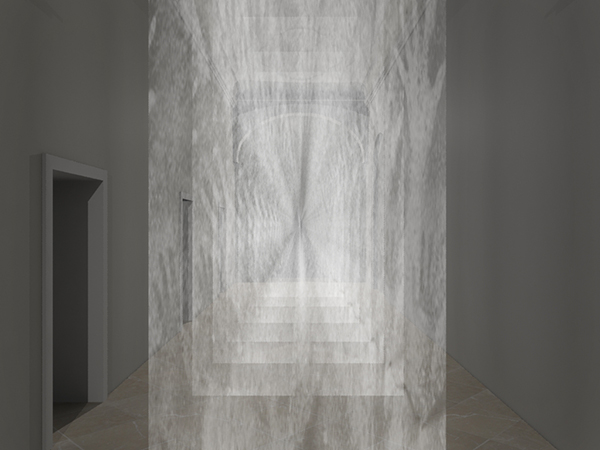Die Handflächen auf den Stoffbahnen wirken, als ob Hände von hinten diese anfassen. Durch dieses Raumbild wird eine mystisch aufgeladene Atmosphäre erzeugt.