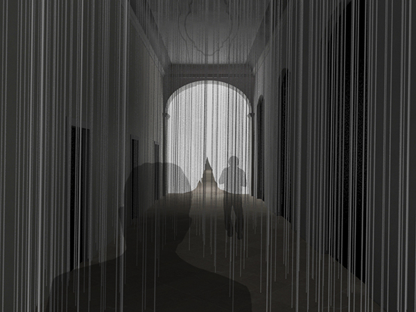 Abgehängte, helle Fäden erinnern an eine abstrahierte Naturszene. Auf diese Weise soll der Durchgang bewusst als Weg wahrgenommen werden.
